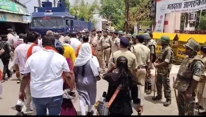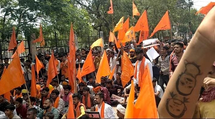 पुलिस प्रशासन द्वारा बलौदाबाजार में हुई घटना की सबक लेकर भारी पुलिस बल के साथ चाक चौबंद व्यवस्था कर रखी थीदुर्ग – विश्व हिंदू परिषद बजरंग दल द्वारा आज कलेक्ट्रेट का घेराव कर ज्ञापन सौपा जिसमे कलेक्टर महोदया को ज्ञापन सौंपकर प्रमुख बिंदुओं पर चर्चा की गई । पाकिस्तान जिंदाबाद ,सर तन से जुदा के नारे लगाने वालो को चिन्हित कर उन पर कड़ी से कड़ी कार्यवाही की जाए।. सुनवाई के दौरान कोर्ट परिसर में मुस्लिम समुदाय द्वारा जानलेवा हथियार लेकर जाना एवम कोर्ट के निर्णय की अवहेलना करते हुए पुष्पराज पर हमला करने दौड़ना।. पिछले पांच वर्षो में जो मुस्लिम बस्तियां बसी है उनकी जांच कर उन बस्तियों में रह रहे व्यक्तियों के आधार कार्ड की भी जांच हो कि कहीं वह रोहिंग्या बांग्लादेशी तो नही है ।इन तीन सूत्रीय माँगो को लेकर विहीप प्रांत सह मंत्री घनश्याम चौधरी जी, प्रांत सह मंत्री नंदूराम जी साहू, बजरंग दल प्रांत संयोजक ऋषि मिश्र जी, विभाग मंत्री अनिल सिंह गुर्जर जी, विभाग संयोजक शैलेंद्र सोनी, सह संयोजक राकेश तिवारी, जिला कार्यकरणी मनीष बुचासिया, पारस जंघेल, ऐश्वर्य सोनी, ठाकुर निहाल, बबलू सिंह, विमलेश तिवारी, प्रवीण रामरेड्डी, सौरभ देवांगन, खेमलाल सेन, टिक्कू निषाद, पिंटू जाल, आदित्य सिंह, जीवेश उपाध्याय, जितेश सिंह, सुनील वैष्णव, राजीव चौबे, सजन श्रीमाली, बलदाऊ साहू, नरसिंग सिन्हा, आशुतोष तिवारी, इंद्रजीत सोनकर, महेश यादव, शुभम चिंचुलकर, हरिदास वैष्णव, राम बिहारी, महेश नायडू, जसमीत सिंग, पुष्पराज राजपूत, राजेश यादव,भावेश चावड़ा, बबलू, युवराज, मिलाप, खिलावन पार्थी, वरुण निषाद के साथ हज़ारो की संख्या में कार्यकर्ता उपस्थित थे।Post navigationहिंदू राष्ट्र और राम राज्य की स्थापना हो इस उद्देश्य को लेकर बजरंगी भाइयों ने रक्तदान किया पीएससी घोटाला कर युवाओं का भविष्य चौपट करने वाली, युवाओं का 15 हजार करोड़ का भत्ता खाने वाली कांग्रेस किस मुंह से युवाओं की बात कर रही है:ललित चंद्राकर