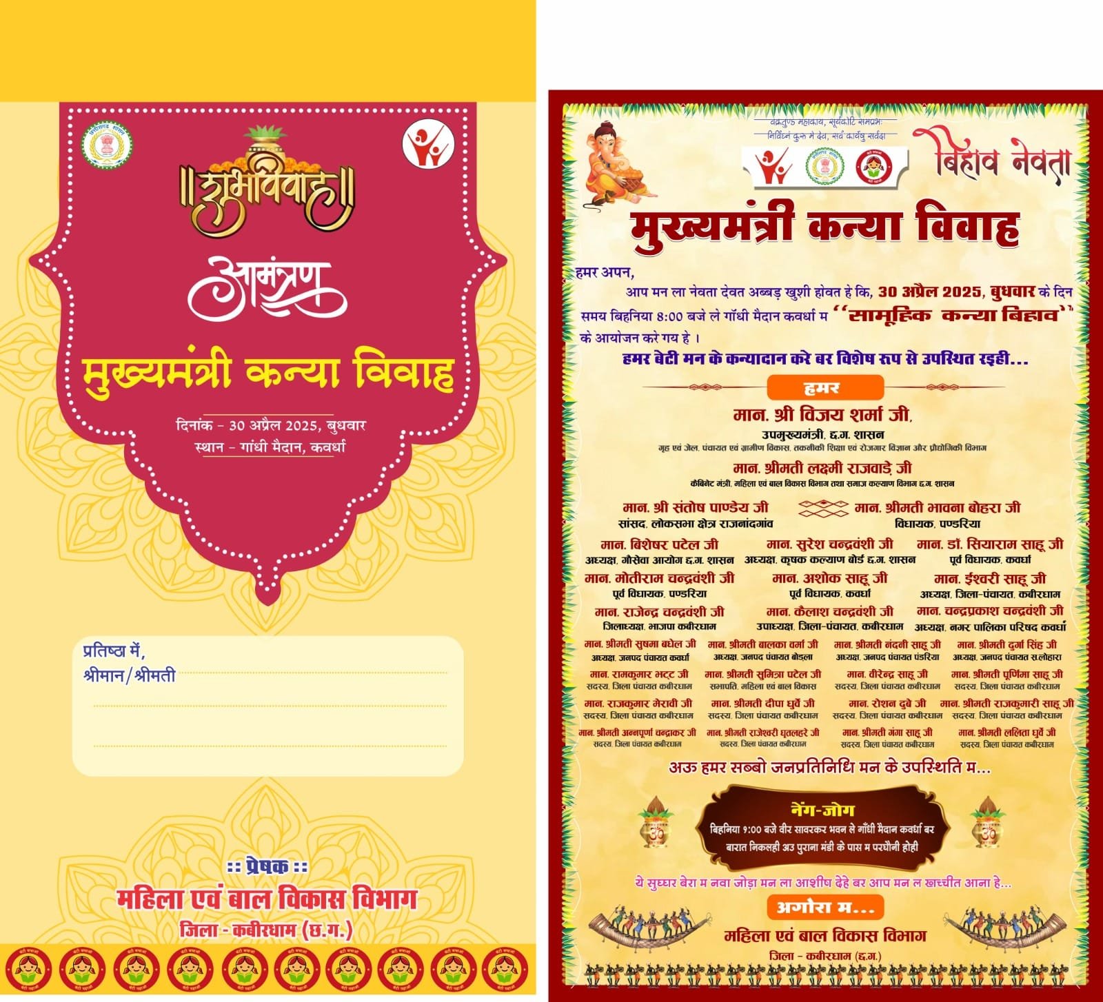 कबीरधाम कवर्धा छत्तीसगढ़ मुख्यमंत्री कन्या विवाह योजना : 101 जोड़े बुधवार 30 अप्रैल को लेंगे सात फेरे April 28, 2025 Shailendra Gupta कवर्धा, 28 अप्रैल 2025। गांधी मैदान कवर्धा में 30 अप्रैल को राज्य शासन द्वारा संचालित मुख्यमंत्री कन्या विवाह योजना के तहत कबीरधाम जिले के 101 नवदंप्त जोड़े विवाह के शुभ…