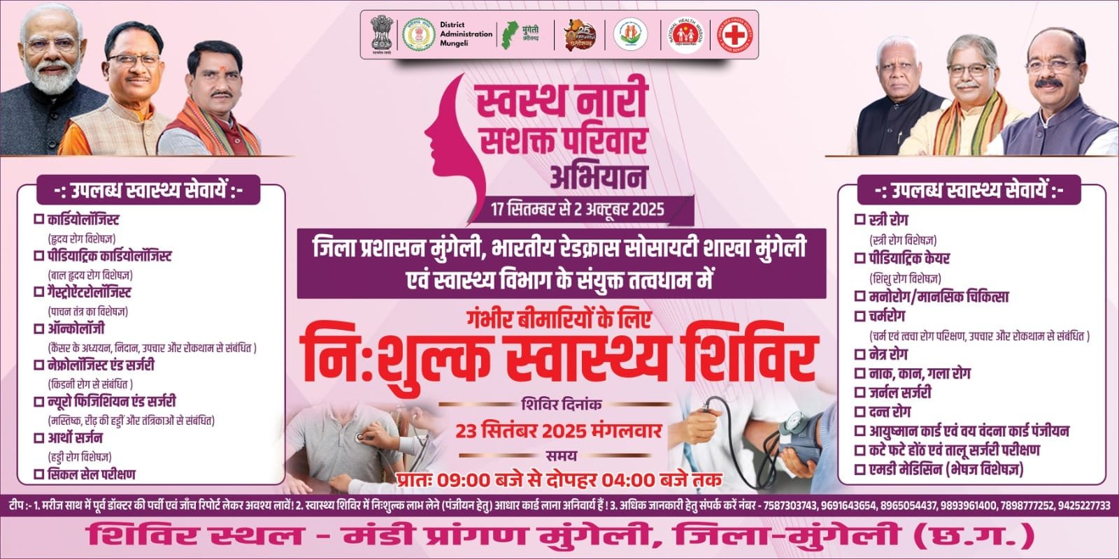 मुंगेली छत्तीसगढ़ स्वस्थ नारी, सशक्त परिवार अभियान’: आदर्श मंडी परिसर में निःशुल्क मेगा स्वास्थ्य शिविर 23 सितम्बर को September 22, 2025 Shailendra Gupta जिला जनसंपर्क कार्यालय मुंगेली (छ.ग.) समाचार स्वस्थ नारी, सशक्त परिवार अभियान’: आदर्श मंडी परिसर में निःशुल्क मेगा स्वास्थ्य शिविर 23 सितम्बर को उपमुख्यमंत्री साव मुख्य अतिथि के रूप में होंगे…
