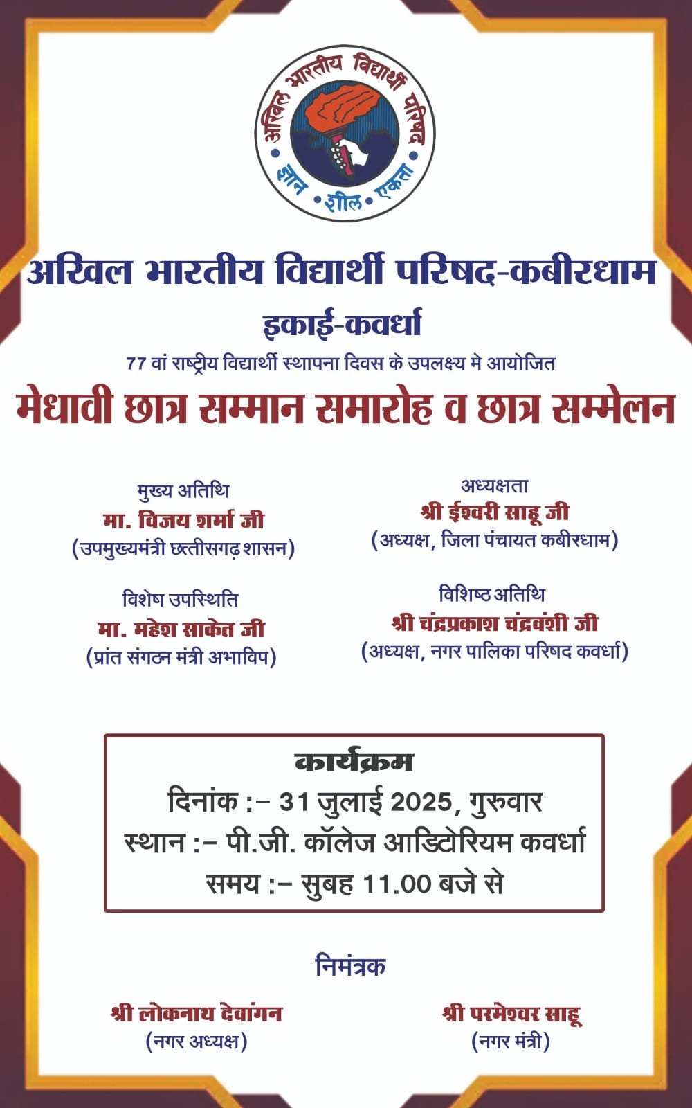 कवर्धा । जिला संयोजक गजाधर वर्मा ने बताया कि विधार्थी परिषद के 77 वां वर्ष के उपलक्ष्य पर आयोजित किया जा रहा है जिसमें कवर्धा अंतर्गत प्रत्येक शासकीय व अशासकीय स्कूल के विधार्थी जो 10 वीं व 12 वीं में प्रथम स्थान प्राप्त किया है उनको सम्मानित किया जाएगा ऐसा पहली बार होगा जब एक ही मंच पर सभी स्कूलों के विधार्थियों को सम्मानित किया जाएगा । साथ ही इस सम्मेलन में सांस्कृतिक कार्यक्रम, रंगोली प्रतियोगिता व चित्रकला का भी आयोजन रखा गया है , जिसमें प्रथम स्थान प्राप्त करने वाले विधार्थियों को सम्मानित किया जाएगा।नगर मंत्री परमेश्वर साहू ने कार्यक्रम को लेकर कहा कि यहां कार्यक्रम केवल एक माध्यम बनेगा जिसमें आने वाले सभी स्कूलों के विधार्थियों के लिए एक परिचय करने का मौका मिलेगा जिससे उनके रहन,सहन व पहनावे का आकलन विधार्थी करेंगे इस कार्यक्रम में सैकड़ों विधार्थी सम्मिलित होंगे ।इस कार्यक्रम में मुख्य अतिथि के रूप में छत्तीसगढ़ शासन के उपमुख्यमंत्री माननीय विजय शर्मा जी, इस कार्यक्रम की अध्यक्षता करेंगे जिला पंचायत अध्यक्ष ईश्वरी साहू जी , विशिष्ट अतिथि के रूप में चंद्रप्रकाश चंद्रवंशी जी व विशेष उपस्थिति हम सब के बीच प्रांत संगठन मंत्री महेश साकेत जी का रहेगा जिनका उद्बोधन हम सब को सुनने को मिलेगा । Post navigationमुख्यमंत्री ने 20 ग्राम पंचायतों में सीसी रोड निर्माण के लिए प्रति ग्राम ₹5-5 लाख की घोषणा, उपमुख्यमंत्री ने दाढ़ी नगर पंचायत कार्यालय भवन हेतु ₹1.25 करोड़ की स्वीकृति दी कलेक्टर गोपाल वर्मा ने राजस्व समाधान शिविरों को बताया प्राथमिकता, राजस्व निरीक्षक और पटवारियों को अनिवार्य उपस्थिति के निर्देश