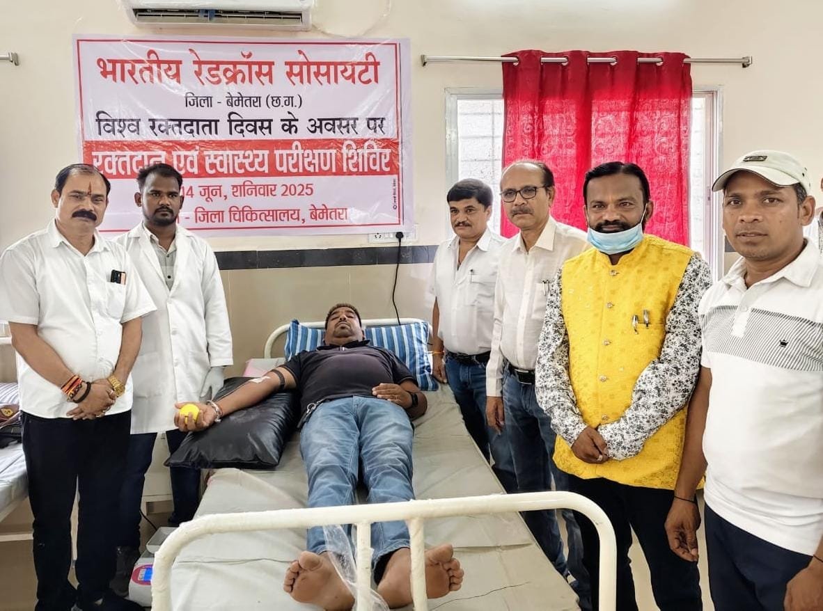 बेमेतरा, 14 जून 2025 । विश्व रक्तदान दिवस के अवसर पर भारतीय रेडक्रॉस सोसायटी जिला शाखा बेमेतरा एवं जिला चिकित्सालय बेमेतरा के संयुक्त तत्वावधान में स्वैच्छिक रक्तदान एवं स्वास्थ्य परीक्षण शिविर तथा सम्मान समारोह का आयोजन किया गया। कार्यक्रम का सफल संचालन कलेक्टर एवं रेडक्रॉस सोसायटी के सह-अध्यक्ष रणबीर शर्मा के मार्गदर्शन में हुआ। इस अवसर पर मुख्य रूप से मुख्य चिकित्सा एवं स्वास्थ्य अधिकारी, एवं रेडक्रॉस जिला संगठक के सदस्य उपस्थित रहे। शिविर में कुल 33 यूनिट रक्तदान किया गया। रक्तदान शिविर के साथ-साथ समाजसेवियों और रक्तमित्रों का सम्मान समारोह भी आयोजित किया गया। इस अवसर पर उपस्थित अधिकारियों एवं अतिथियों ने स्वैच्छिक रक्तदान के महत्व पर प्रकाश डाला और समाज के सभी वर्गों से आगे आकर नियमित रूप से रक्तदान करने की अपील की।