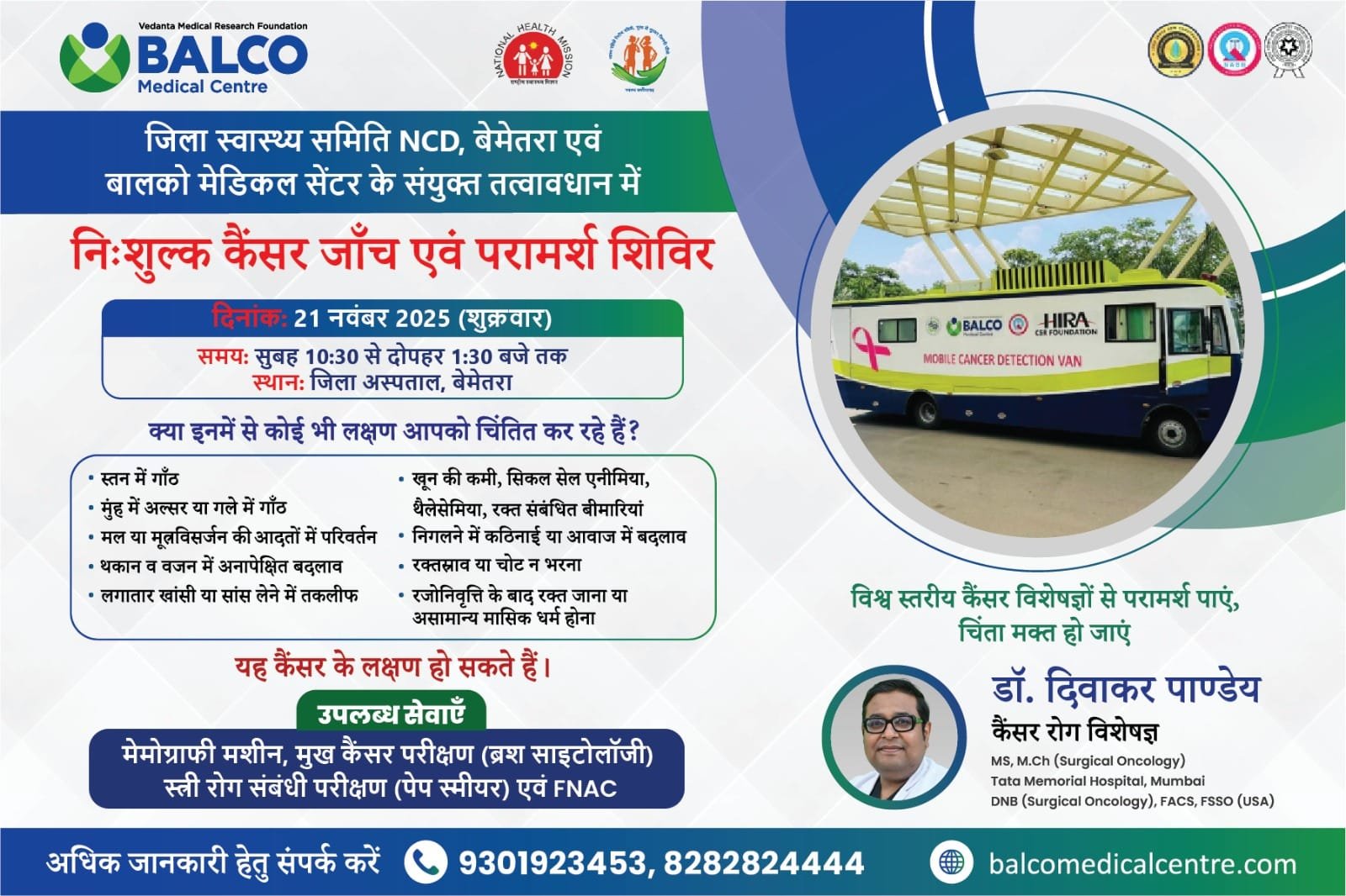 बेमेतरा छत्तीसगढ़ जिला चिकित्सालय बेमेतरा में 21 नवम्बर को निःशुल्क कैंसर जांच एवं परामर्श शिविर का आयोजन November 20, 2025 Shailendra Gupta बेमेतरा, 20 नवंबर 2025 । स्वास्थ्य विभाग जिला बेमेतरा में जिला वासियों के लिए विशेषज्ञ चिकित्सक द्वारा चिकित्सा सुविधा उपलब्ध कराने जिला अस्पताल बेमेतरा में 21 नवम्बर शुक्रवार को निःशुल्क…