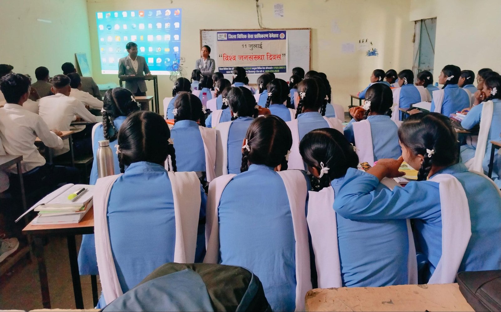 बेमेतरा 11 जुलाई 2025 । राष्ट्रीय विधिक सेवा प्राधिकरण, नई दिल्ली के आदेशानुसार व राज्य विधिक सेवा प्राधिकरण, बिलासपुर द्वारा संचालित स्टेट प्लान ऑफ एक्शन कैलेंडर 2025 के अनुसार माह जुलाई 2025 विश्व जनसंख्या दिवस के अवसर पर अध्यक्ष / प्रधान जिला न्यायाधीश बृजेन्द्र कुमार शास्त्री के मार्गदर्शन में व निधि शर्मा सचिव जिला विधिक सेवा प्राधिकरण बेमेतरा के निर्देशन में शासकीय उच्चतर माध्यमिक विद्यालय कठिया एवं शासकीय पूर्व माध्यमिक शाला रजकुड़ी में 11 जुलाई विश्व जनसंख्या दिवस के अवसर पर विधिक जागरूकता शिविर का आयोजन किया गया। उक्त शिविर में छात्र-छात्राओं को बताया गया कि विश्व जनसंख्या दिवस का मुख्य उद्देश्य जनसंख्या संबंधित समस्याओं पर वैश्विक चेतना जागृत कर एवं लोगों को परिवार नियोजन, लिंग समानता, गरीबी मातृ स्वास्थ्य और मानव अधिकार जैस विभिन्न जनसंख्या संबंधी मुद्दों के बारे मे जागरूक करने की जानकारी दी गई। साथ ही इलेक्ट्रानिक उपकरण व प्रोजेक्टर के माध्यम से नालसा व सालसा द्वारा संचालित योजनाओं जैसे पॉक्सो एक्ट अधिनियम, बाल विवाह, बाल श्रम, किशोर न्याय अधिनियम, ड्रग मुक्त भारत डॉन योजना, नवीन मोटरयान अधिनियम, घरेलू हिंसा अधिनियम के संबंध में महत्पूर्ण जानकारी दी गई। उक्त शिविर में स्कूल के प्राचार्य, शिक्षकगण और समस्त अधिकार मित्र उपस्थित रहें। उक्त दिवस के अवसर पर तालुका विधिक सेवा समिति साजा के ग्राम गाड़ाभाठ व लीगल एड डिफेंस कौंसिल बेमेतरा के द्वारा ग्राम सल्धा तथा लीगल एड क्लिनिक प्रतापपुर के अधिकार मित्र के द्वारा विश्व जनसंख्या दिवस के संबंध में विधिक जागरूकता शिविर आयोजन कर आमजनों को जानकारी दी गई। Post navigationबेटी बचाओ बेटी पढ़ाओ योजना के तहत विश्व जनसंख्या दिवस पर रैली व कार्यशाला का आयोजन प्रयास आवासीय विद्यालय में कक्षा नवमी में प्रवेश हेतु काउंसलिंग 15 से 18 जुलाई तक