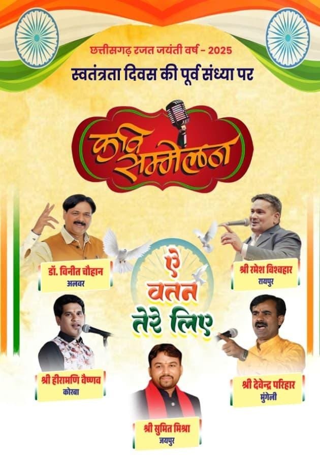 मुंगेली, 12 अगस्त 2025 । स्वतंत्रता दिवस की पूर्व संध्या पर जिला प्रशासन मुंगेली द्वारा एक भव्य कवि सम्मेलन का आयोजन किया जाएगा। कलेक्टर कुंदन कुमार के मार्गदर्शन में आयोजित यह कार्यक्रम 14 अगस्त की शाम 6 बजे कृषि उपज मंडी परिसर में होगा।कार्यक्रम में देश एवं राज्य के चर्चित कवि अपनी ओजस्वी और भावपूर्ण रचनाओं से माहौल को देशभक्ति और साहित्यिक रंग में रंग देंगे। मंच पर अलवर, राजस्थान से डॉ. विनीत चौहान, जयपुर से सुमित मिश्रा, रायपुर से रमेश विश्वहार, कोरबा से हीरामणि वैष्णव और मुंगेली के देवेंद्र परिहार अपनी कविताओं से श्रोताओं को मंत्रमुग्ध करेंगे।जिला प्रशासन ने अधिक से अधिक साहित्य प्रेमियों से इस ऐतिहासिक कवि सम्मेलन में शामिल होकर कार्यक्रम की शोभा बढ़ाने की अपील की है। Post navigationनिजी अस्पतालों और डायग्नोस्टिक सेंटरों की जांच, पायी गयी कई अनियमितताएं स्वतंत्रता दिवस आयोजन का किया गया अंतिम पूर्वाभ्यास