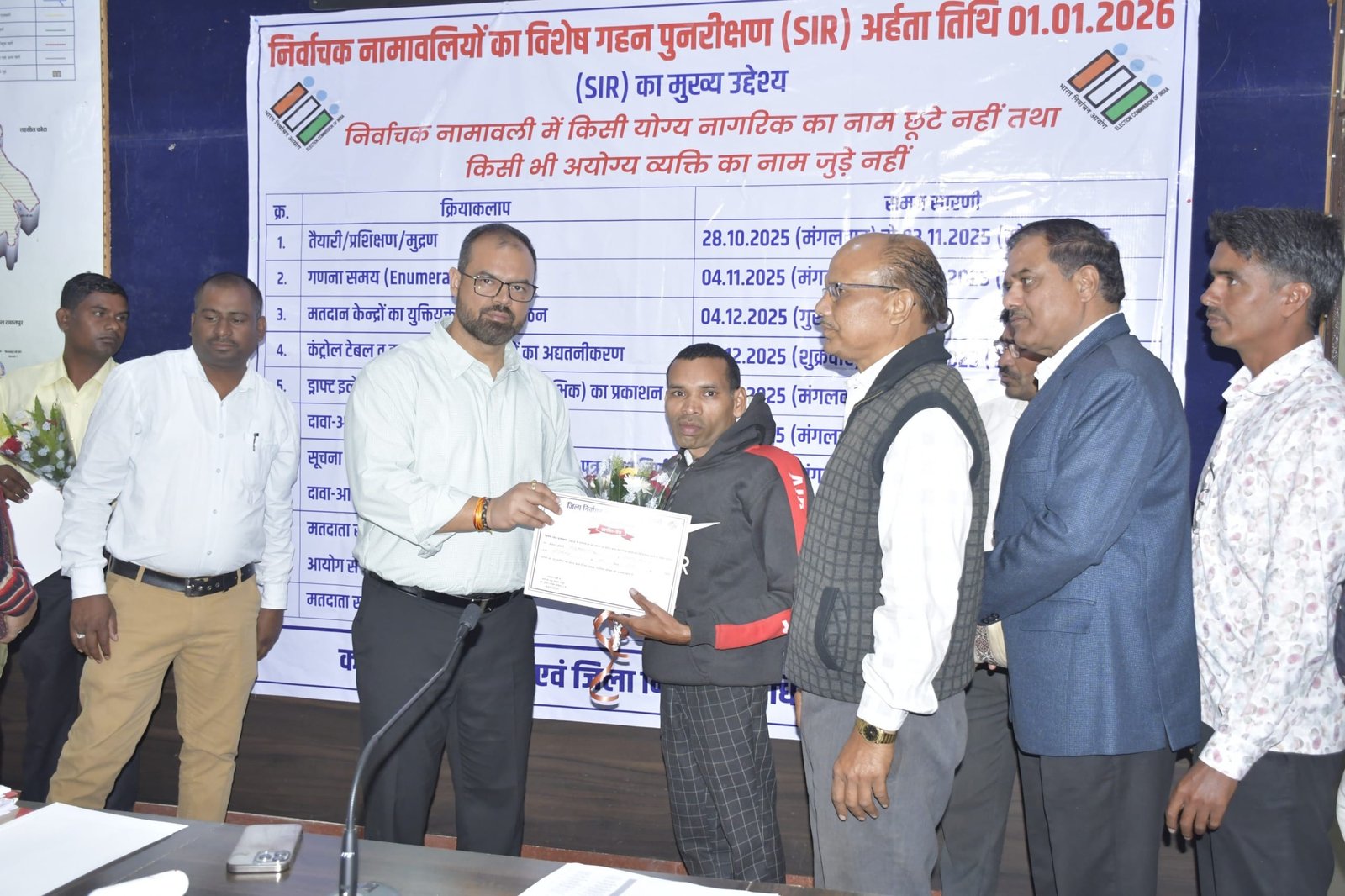 मुंगेली, 27 नवंबर 2025 । कलेक्टर एवं जिला निर्वाचन अधिकारी कुन्दन कुमार के मार्गदर्शन में जिले में विशेष गहन पुनरीक्षण अभियान प्रभावी, पारदर्शी एवं समयबद्ध रूप से संचालित किया जा रहा है। निर्वाचन आयोग द्वारा निर्धारित मानकों के अनुरूप जिले के बीएलओ एवं अभिहित अधिकारियों द्वारा मतदाता सूची के शुद्धिकरण एवं डिजिटाइजेशन कार्य को उत्कृष्टता के साथ पूरा किया जा रहा है। अभियान के दौरान शत-प्रतिशत लक्ष्य प्राप्त करने वाले सरिसताल की बीएलओ लक्ष्मी यादव तथा अभिहित अधिकारी राजू साहू को कलेक्टर ने प्रशस्ति पत्र प्रदान कर सम्मानित किया। बीएलओ यादव ने बताया कि आपसी समन्वय और बेहतर टीमवर्क द्वारा जिम्मेदारी, सतर्कता और समर्पण की भावना के साथ कार्य करने से मतदाता सूची के डिजिटाइजेशन का कार्य समय पर पूरा हुआ है।