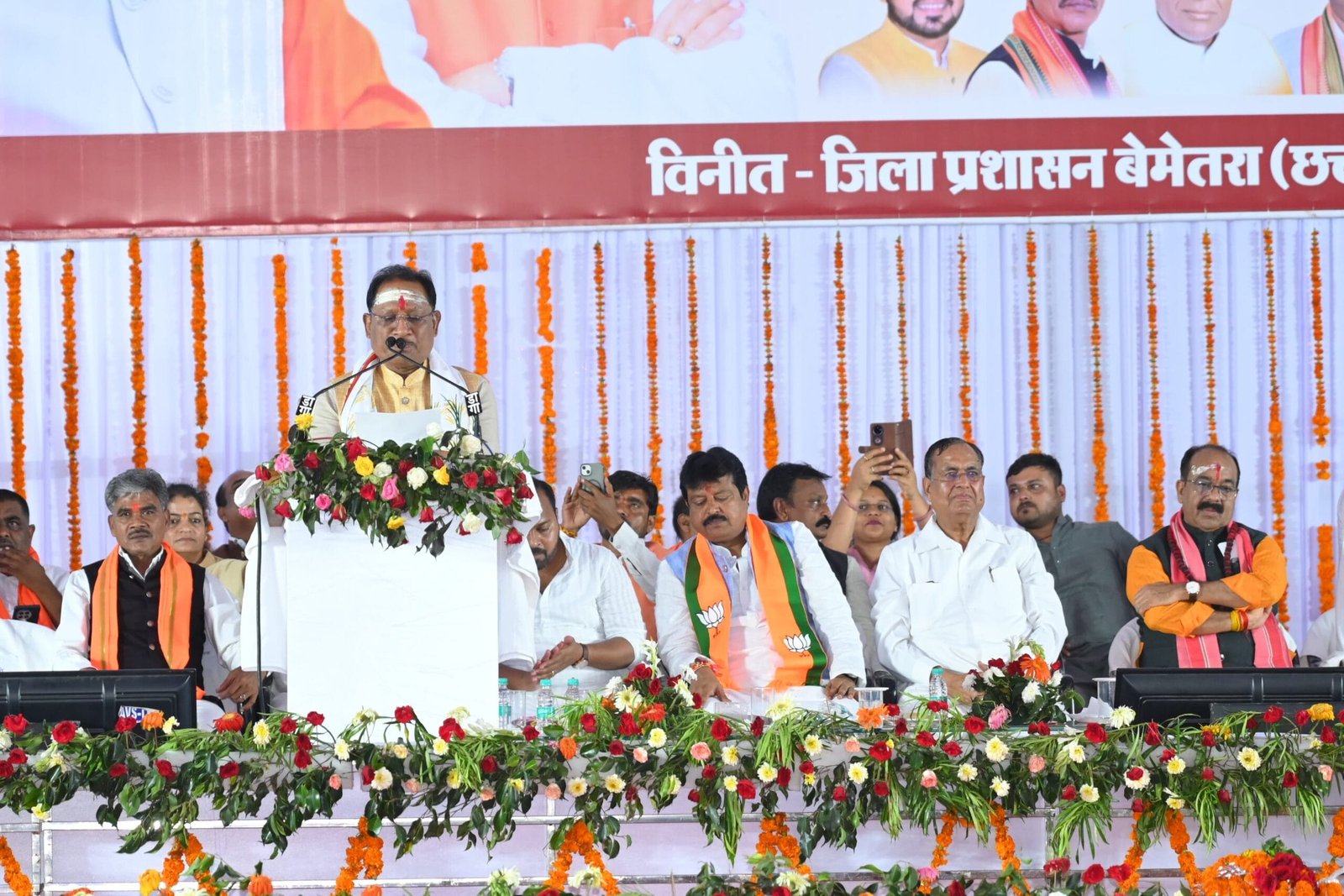 बेमेतरा, 28 जुलाई 2025 । आज नगर पंचायत दाढ़ी में आयोजित भव्य लोकार्पण एवं भूमिपूजन कार्यक्रम में पहुंचे मुख्यमंत्री विष्णुदेव साय ने बेमेतरा जिले के विकास को नई दिशा देते हुए अनेक महत्वपूर्ण घोषणाएं की। कार्यक्रम में उपमुख्यमंत्री अरुण साव, विधानसभा अध्यक्ष डॉ. रमन सिंह, खाद्य मंत्री सह नवागढ़ विधायक दयालदास बघेल, विधायक बेमेतरा दिपेश साहू, राजिम विधायक रोहित साहू, विधायक साजा ईश्वर साहू, अध्यक्ष रजककार विकास बोर्ड प्रहलाद रजक, जिला पंचायत अध्यक्ष कल्पना योगेश तिवारी, नगर पंचायत अध्यक्ष भारती साहू , पूर्व विधान सभा अध्यक्ष गौरी शंकर अग्रवाल, बसना विधायक सम्पत अग्रवाल, साजा पूर्व विधायक लफ़चंद बाफना, बेमेतरा पूर्व विधायक अवधेश चंदेल, जिला भाजपा अध्यक्ष अजय साहू, आईजीपी दुर्ग रेंज राम गोपाल गर्ग, कलेक्टर रणवीर शर्मा, वरिष्ठ पुलिस अधीक्षक रामकृष्ण साहू, जिला पंचायत सीईओ टेकचंद अग्रवाल, पूर्व भाजपा अध्यक्ष राजेंद्र शर्मा, ओमप्रकाश जोशी, एवं स्थानीय व जिले के जनप्रतिनिधि जिला प्रशासन के वरिष्ठ अधिकारी/कर्मचारी, जनप्रतिनिधि एवं जिले के नागरिक बड़ी संख्या में उपस्थित रहे।मुख्यमंत्री साय ने अपने संबोधन में कहा कि छत्तीसगढ़ राज्य खुशहाल और समृद्ध राज्य बनने की ओर तेज़ी से अग्रसर है। राज्य सरकार प्रधानमंत्री नरेंद्र मोदी के संकल्पों को धरातल पर उतारने के लिए पूर्ण प्रतिबद्धता के साथ कार्य कर रही है। उन्होंने कहा कि प्रदेश में विकास सिर्फ आंकड़ों तक सीमित नहीं है, बल्कि यह गांव-गांव और आमजन के जीवन में वास्तविक बदलाव के रूप में दिख रहा है। सरकार का उद्देश्य केवल बुनियादी ढांचे का विकास करना नहीं है, बल्कि हर वर्ग तक योजनाओं का लाभ पहुंचाकर सामाजिक और आर्थिक सशक्तिकरण को मजबूती देना है। साय ने स्पष्ट किया कि छत्तीसगढ़ को आत्मनिर्भर, सुरक्षित और समृद्ध बनाने की दिशा में सरकार ने बीते डेढ़ वर्षों में अनेक ऐतिहासिक निर्णय लिए हैं, जो आने वाले समय में राज्य को मॉडल राज्य के रूप में स्थापित करेंगे।मुख्यमंत्री का संबोधन: “जनता से किए गए हर वादे को निभाया”मुख्यमंत्री ने अपने उद्बोधन में कहा कि राज्य सरकार ने डेढ़ वर्ष के भीतर जनता से किए गए वादों को संकल्पबद्ध होकर पूरा किया है। उन्होंने कहा की हमारी सरकार ने गरीबों के अपने घर के सपने को साकार करते हुए 18 लाख आवासों की स्वीकृति दी है। धान की खरीद 31 सौ रुपए प्रति क्विंटल की दर से की जा रही है। बीते दो वर्षों का बकाया धान बोनस किसानों को प्रदान किया गया है। 70 लाख महिलाओं को महतारी वंदन योजना के माध्यम से हर माह ₹1000 देकर आत्मनिर्भरता की दिशा में सशक्त किया जा रहा है | पंचायतों को डिजिटल रूप से सक्षम बनाने हेतु अटल सेवा केंद्रों की स्